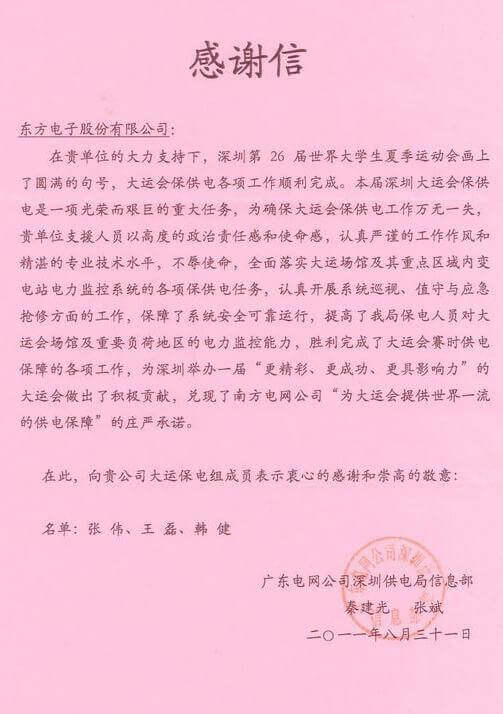 8月23日,世界大学生运动会在深圳圆满落幕,道贞志仁科技(杭州)有限公司作为大运会唯一保电企业见证了世界大学生体育运动的蓬勃发展。道贞志仁科技(杭州)有限公司技术中心系统部与工程部坚守“忠于职守,全力以赴,誓保大运电网安全”的信念,联手实现了大运保供电期间系统零故障、零缺陷的目标。